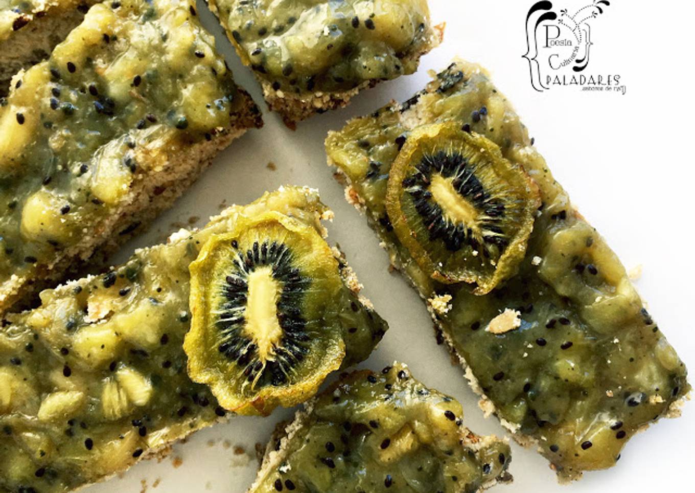 - Una vez la galleta se ha enfriado poner la salsa de kiwi por encima y llevar a refrigerar para que se compacte todo un poco por una hora, luego podremos cortar con cuidado que son bien arenosas en barras y a disfrutar de estas ricas galletas con relleno de mermelada y cubierta salsa de kiwi y matcha, decorar con kiwi deshidratado.